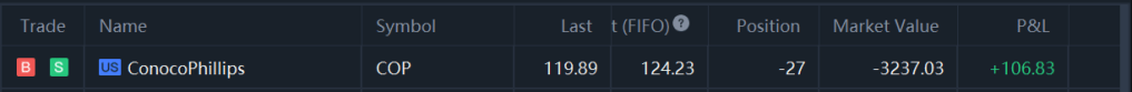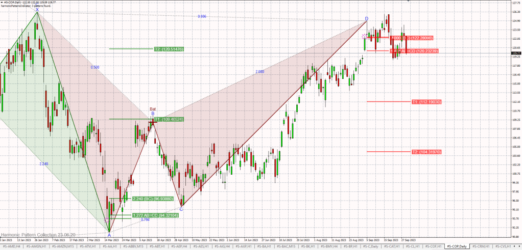 Example 3: ConocoPhillips (COP) Company is an American multinational corporation engaged in hydrocarbon exploration and production. Over the past month, the stock has been showing weakness along with a harmonic pattern to sell. I have nothing against COP (We didn’t even know it existed 2 months ago), but the pattern tell us this pair needs to fall down and hence we have shorted the stock. This will take a few months to materialize and I expect it to hit 112 as our target 1. The stop loss is at 125.86 and if this is hit, I lose 1% of our equity.